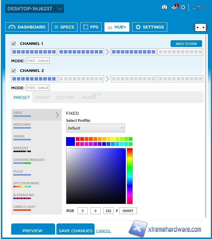 Come possiamo vedere dalle immagini a seguire, potremo configurare diversi effetti visivi come ‘’Fixed’’, ‘’Breathing’’, ‘’Fading’’, ‘’Marquee’’, ‘’Covering Marquee’’, ‘’Pulse’’, ‘’Spectrum Wave’’, ‘’Alternating’’, ‘’Candle Light’’. Tutti questi effetti modificabili in diversi colori permetteranno di selezionare l’effetto migliore per la nostra build. Non finisce qui la possibilità di personalizzare il sistema HUE+, infatti la Tab ‘’Preset’’ raccoglie gli effetti visivi classici impostabili ma spostandoci nelle altre Tabs sempre del Menù ‘’HUE+’’ potremo agire ad esempio su un’impostazione di colore per segnalare un eventuale aumento di temperatura per la CPU o la GPU, o ancora in gioco. Infine l’NZXT HUE+ introduce anche l’Audio Visualizer forse una delle funzioni più interessanti offerte dal controller. Selezionandola e scegliendo i diversi colori in scala, una volta avviato un brano con ad esempio bassi profondi otterremo un effetto visivo crescente sulla striscia all’aumenterà dell’intensità sonora. Ovviamente tale funzione funziona a ritmo ed in base ai dBA rilevati nel segnale audio, quindi maggiore saranno questi ultimi maggiore sarà la possibilità di vedere tutti i LED accesi. Funzione davvero ben fatta anche se viene data ancora come fase ‘’BETA’’.
