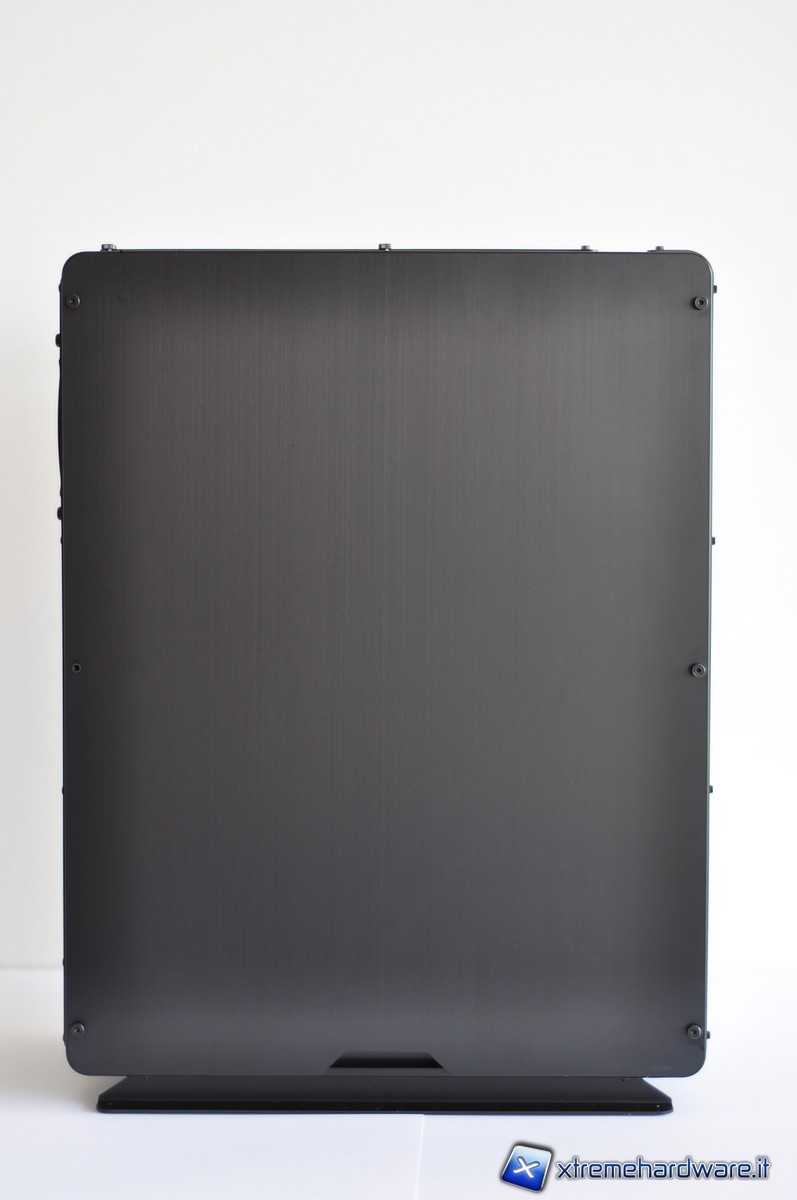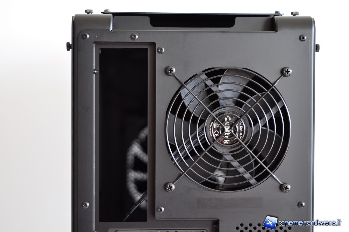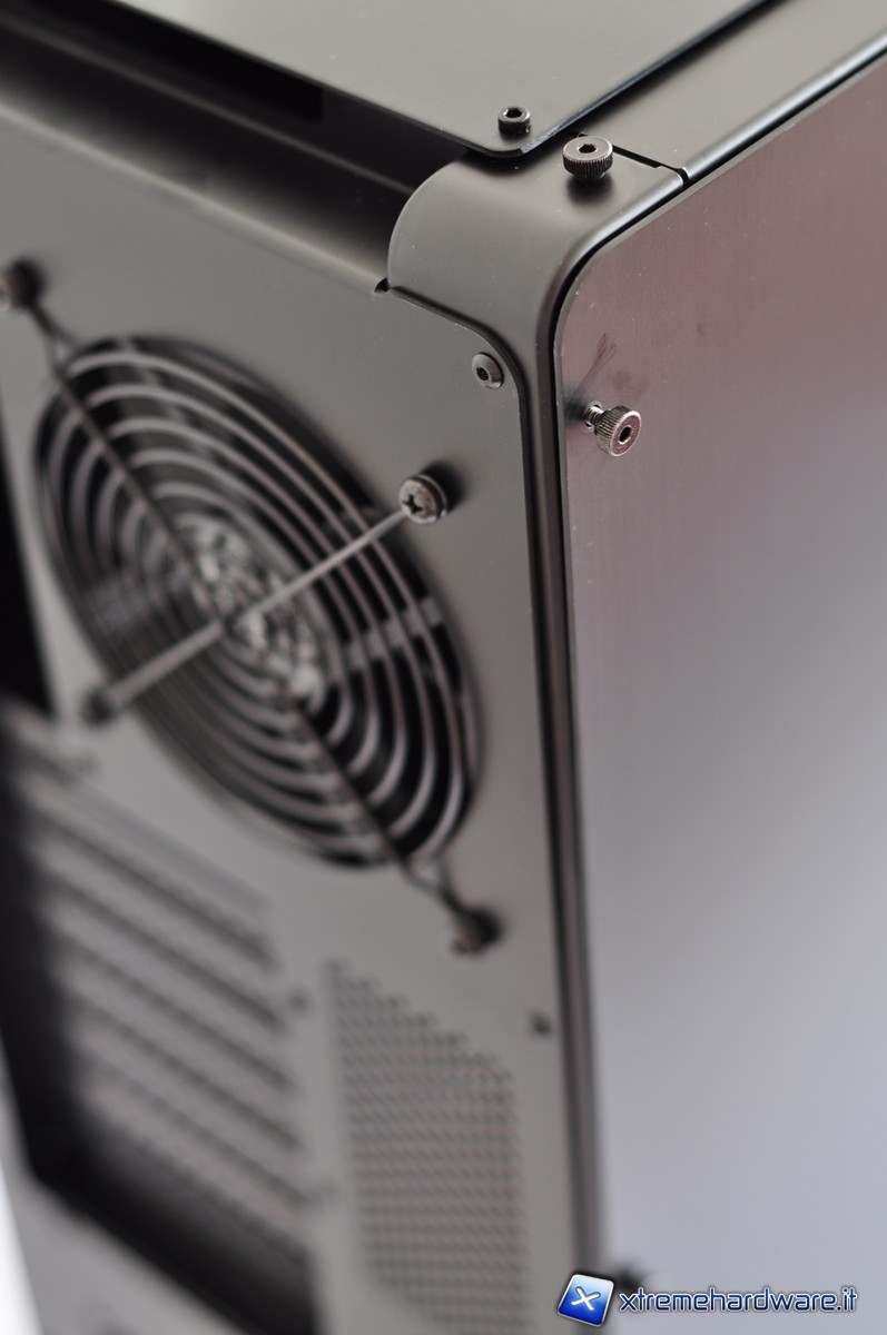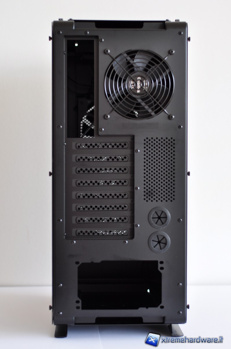 Nella parte posteriore è possibile notare i fori per il passaggio dei tubi dell’impianto a liquido con tanto di guarnizione per evitare che la lamiera possa incidere la gomma. Le piastrine copri-slot PCI sono forate (presentando un grazioso pattern di cerchi) e fissate per mezzo di comode thumbscrew.