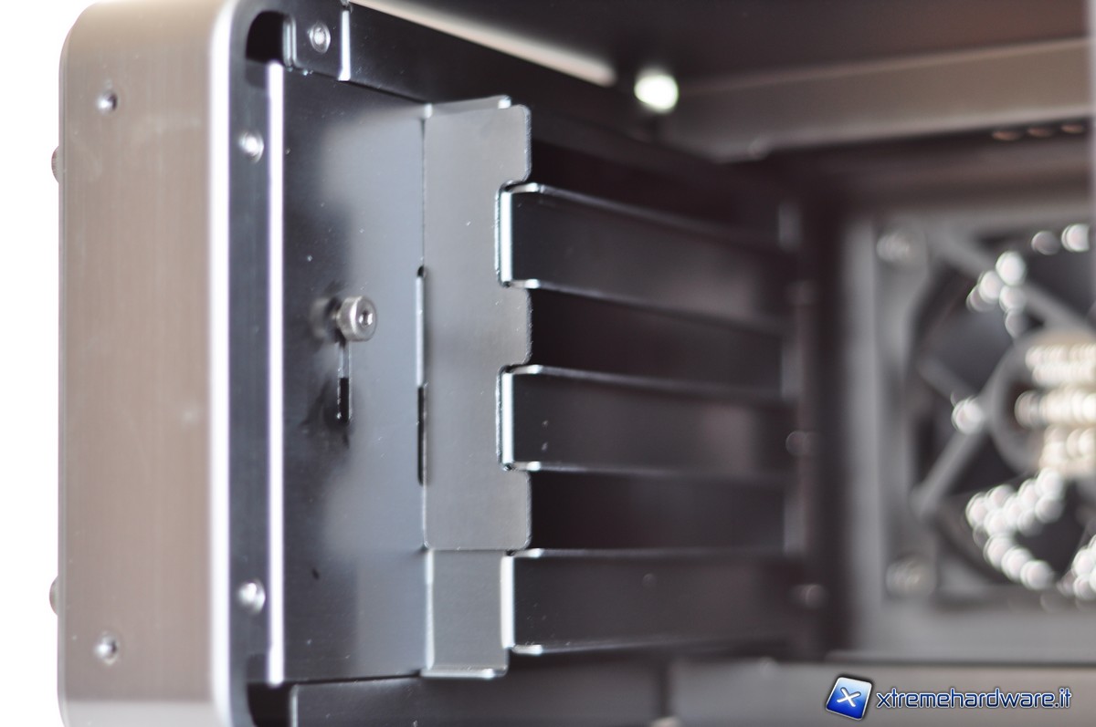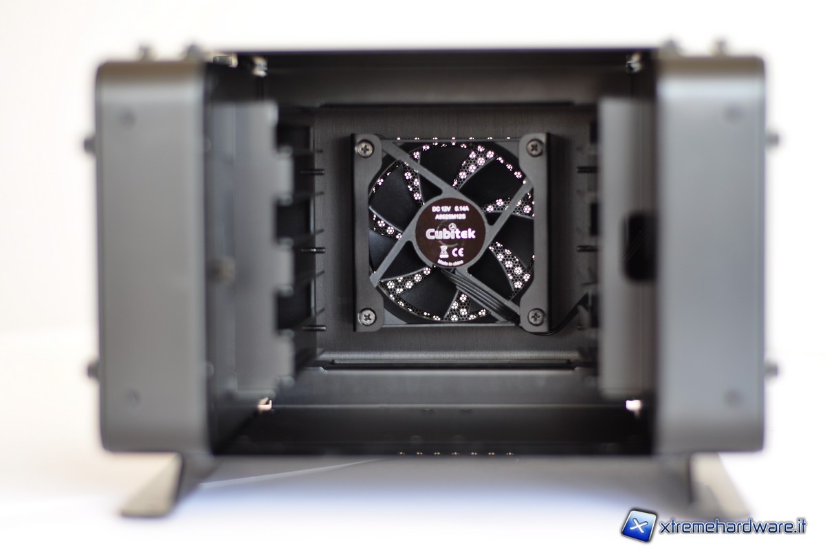 L’interno presenta delle guide per supportare il montaggio di 3 hard disk da 3.5”. Il sistema di montaggio degli hard disk è piuttosto curioso ed pratico. Nel bundle sono presenti 12 gommini a forma di ruota e delle apposite viti con distanziale. Si montano questi gommini per mezzo delle viti sull’hard disk, poi basta far scorrere i gommini sulle rotaie. Basterà poi far scivolare la piastrina basculante allentando l’apposita vite per poi rifissarla in maniera tale da serrare gli hard disk e il gioco è fatto. I gommini garantiscono l’assorbimento delle vibrazioni riducendo il rumore prodotto dal sistema. Sul pannello frontale è presente una ventola da 80 mm con filtro antipolvere dedicata al raffreddamento del modulo. Gli hard disk, grazie alla distanza tra i vari slot, possono davvero trarre giovamento da questo sistema di raffreddamento. Unico neo è che questa ventola dal diametro ridotto risulta un po’ rumorosa.