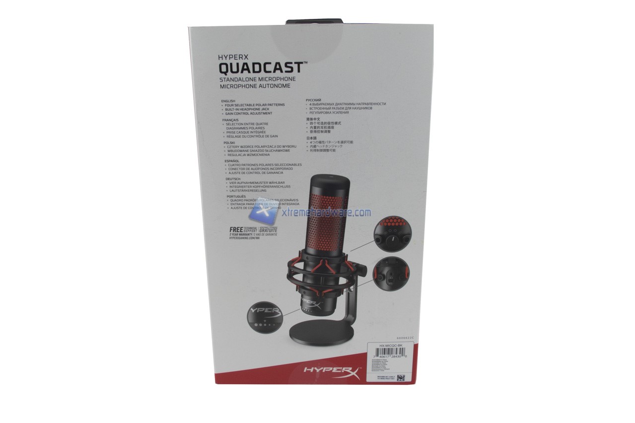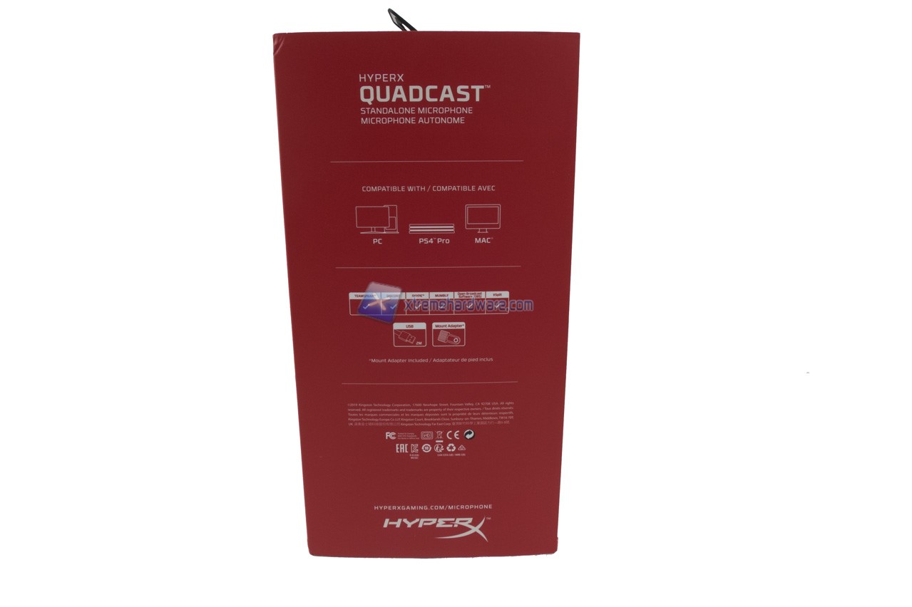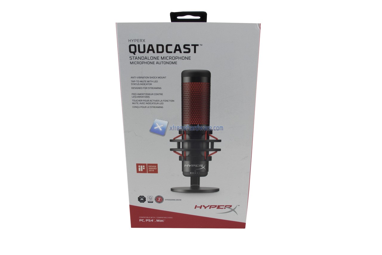 Passiamo ora a dare uno sguardo alla confezione in cui giunge il microfono HyperX QuadCast. Realizzata in cartone presenta la medesima grafica a sfondo bianco con qualche tocco di rosso vista con precedenti periferiche. Non mancano tutte le principali informazioni, in diverse lingue, e diverse immagini illustrative del prodotto.