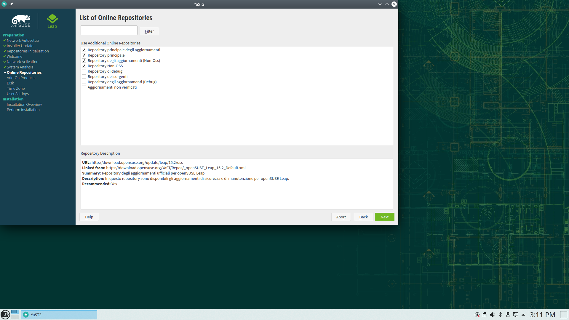 A questo punto inizia l'analisi del Sistema ed essendo connessi ad Internet ci viene proposto di installare Repository aggiuntivi disponibili online, tra i quali anche quelli non OSS. Lo step successivo è quello di scegliere il Desktop Environment, nel nostro caso KDE.